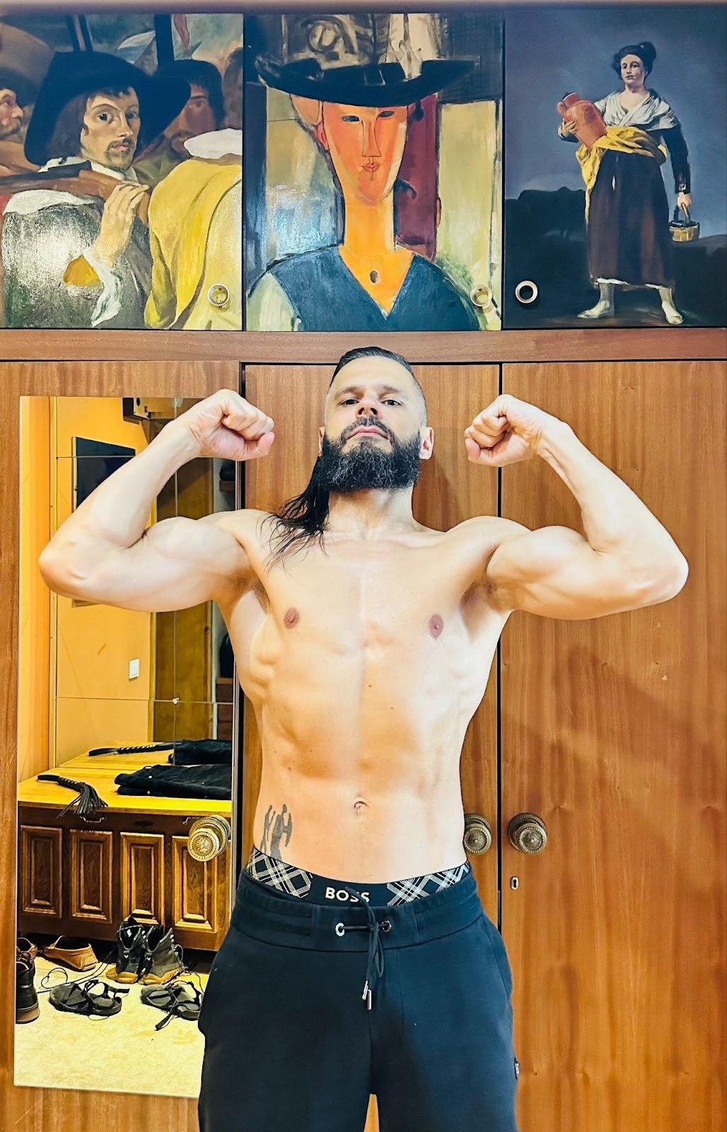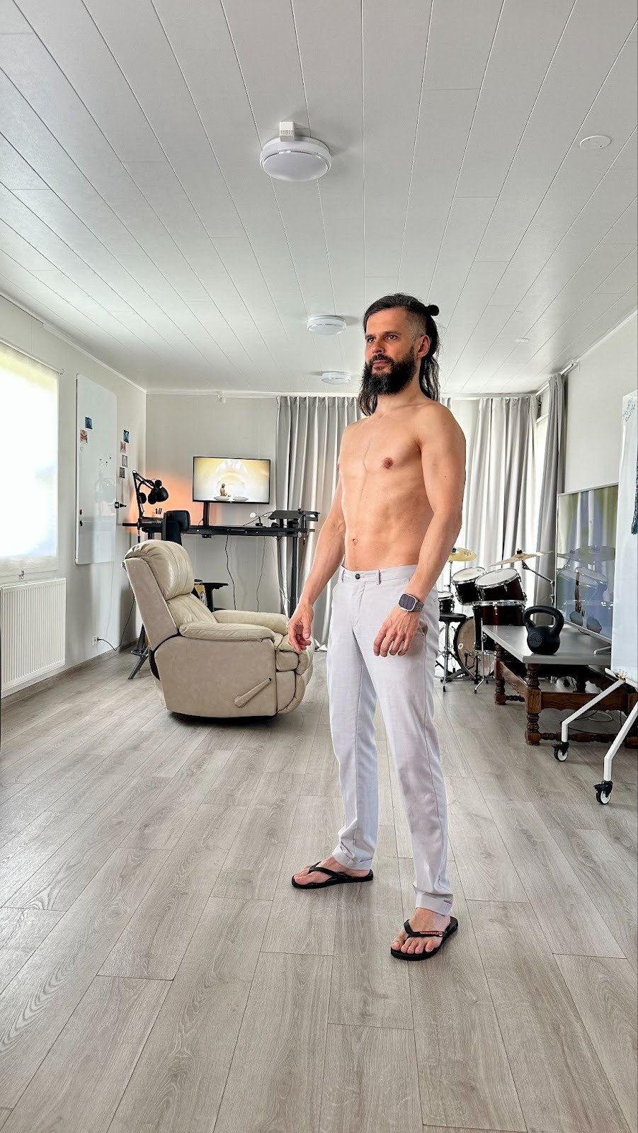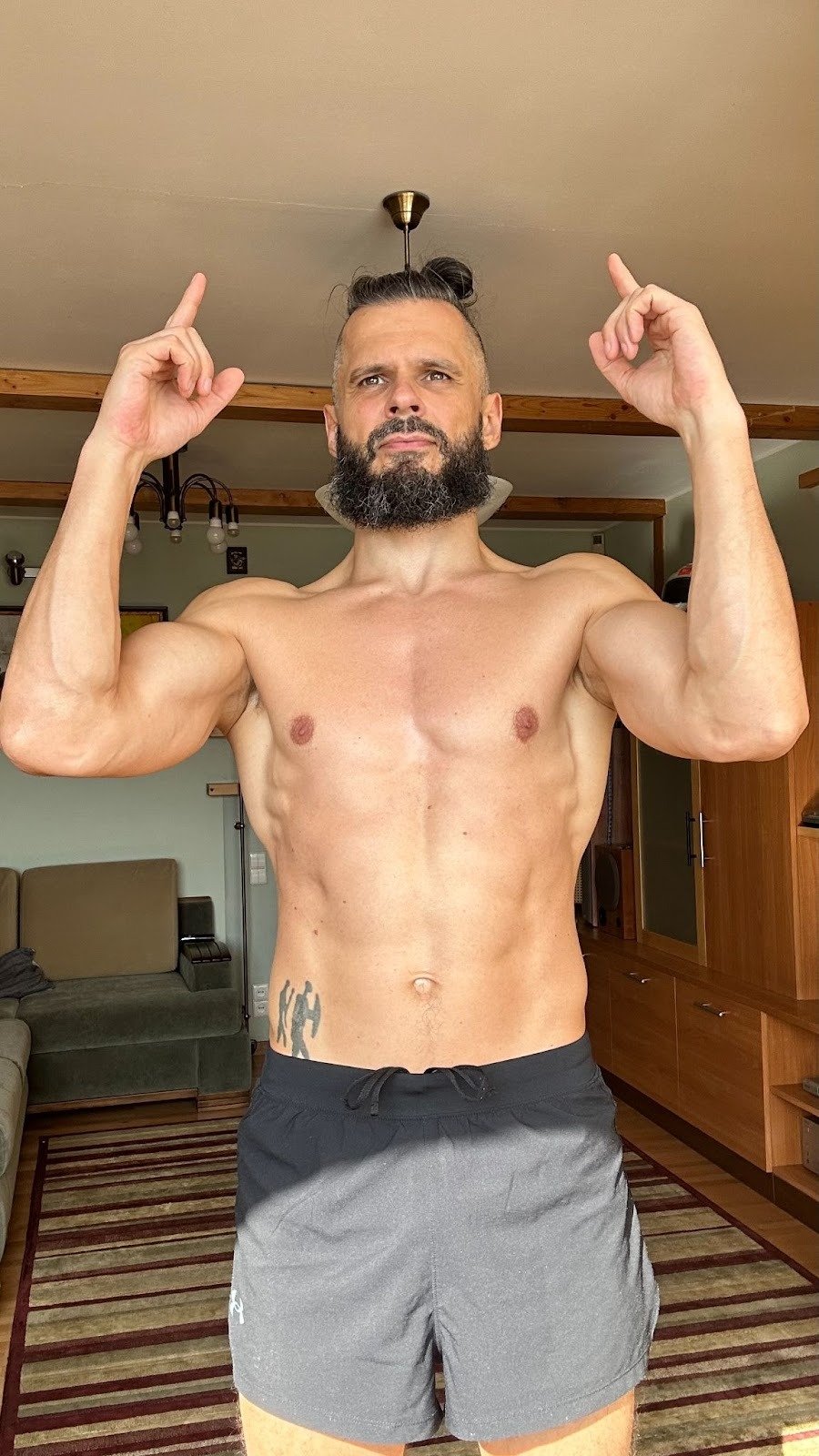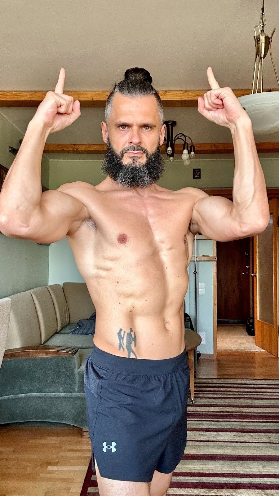 Home equipment only – currently, just 3 kettlebells (16, 24 and 32KG), and a set of parallettes – as well as public fitness spaces (mainly, pullup bars).